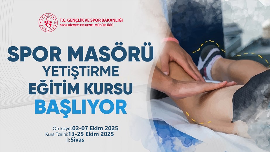 Sivas'da düzenlenecek olan Spor Masörü Yetiştirme Eğitim Kursu, 13-25 Ekim 2025 tarihleri arasında Sivas Cumhuriyet Üniversitesi Spor Bilimleri Fakültesinde yapılacaktır.
